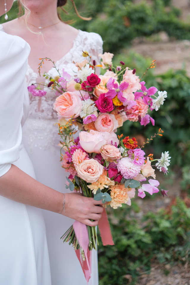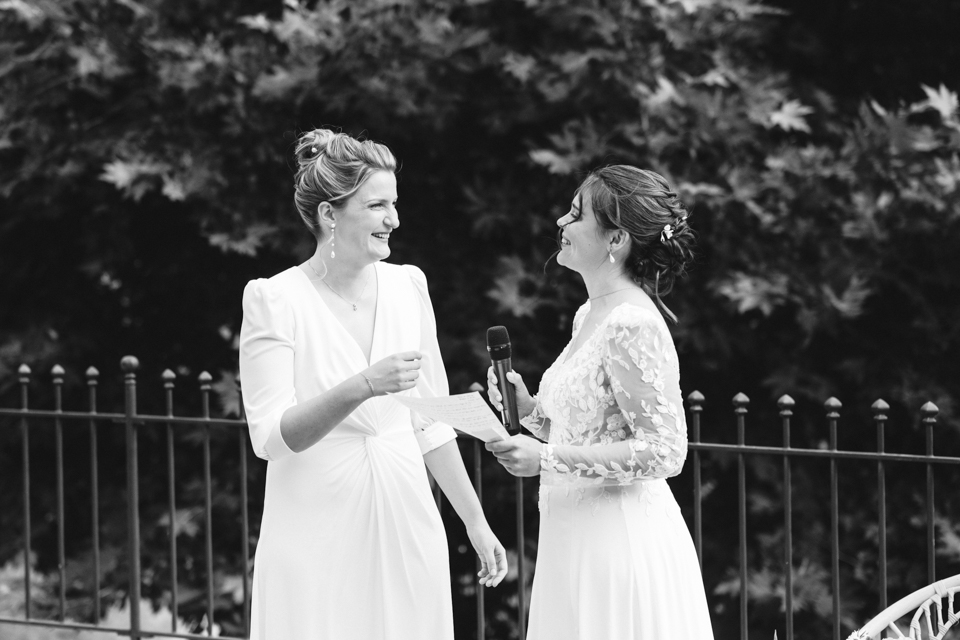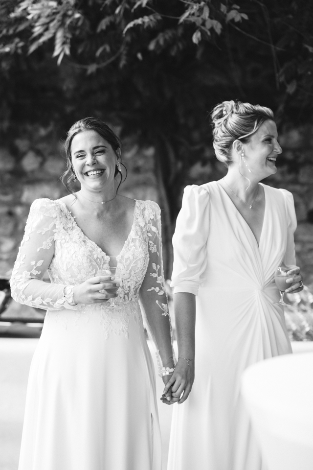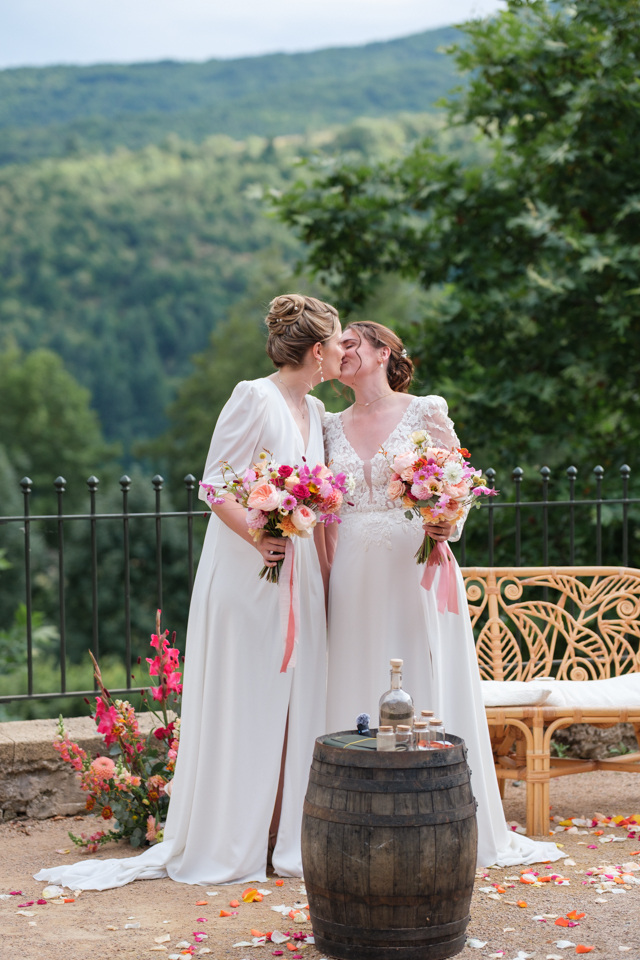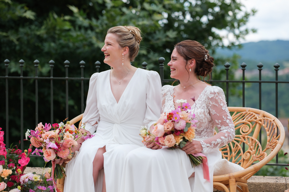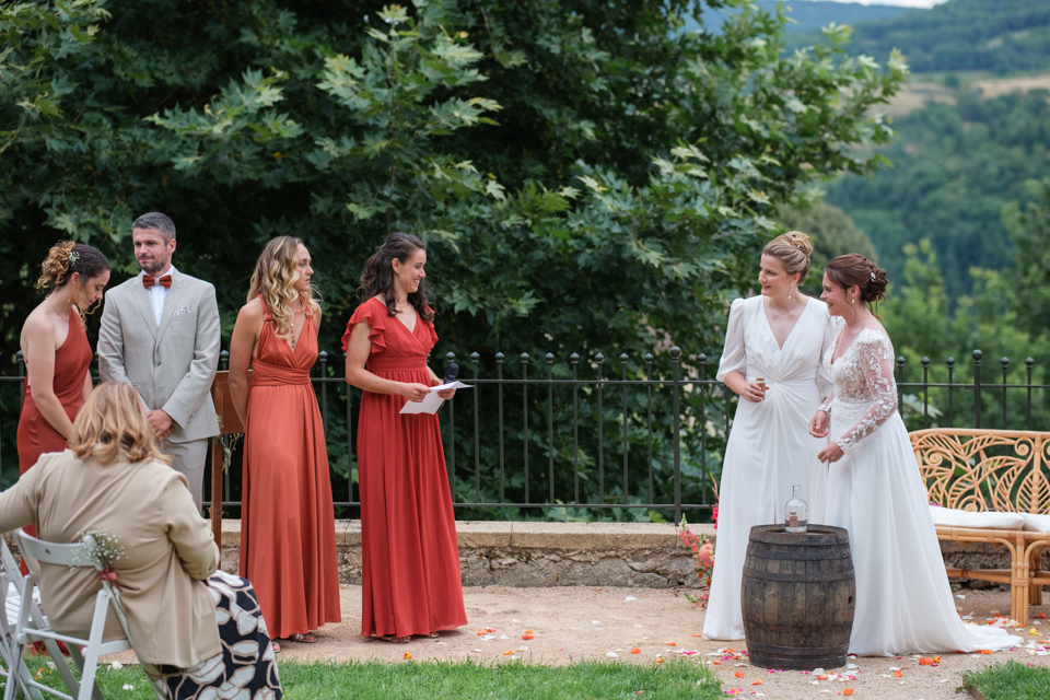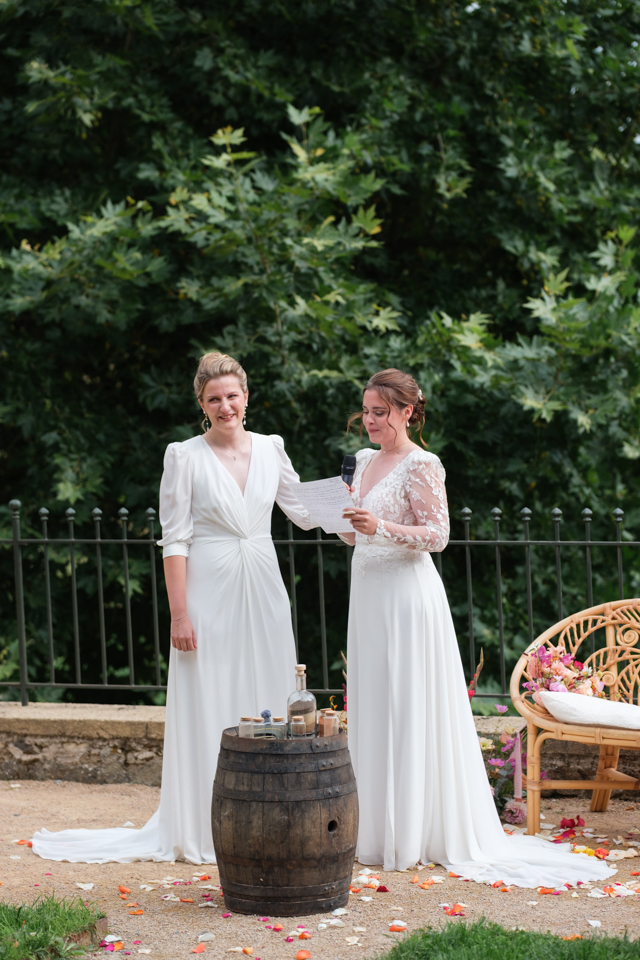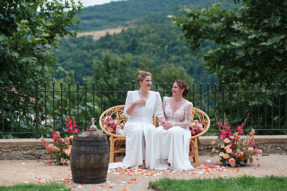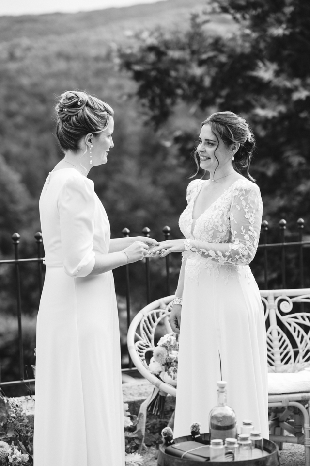 Nous avons débuté la journée avec les préparatifs des mariées dans une ambiance décontractée dans les belles chambres du Domaine. Ensuite, place à la cérémonie laïque dans le jardin autour de la fontaine, avec une vue magnifique comme toile de fond et une décoration florale colorée. Une cérémonie orchestrée par le père d’une des mariées avec talent, pleine d’émotions et de joie avec le rituel symbolique du sable.